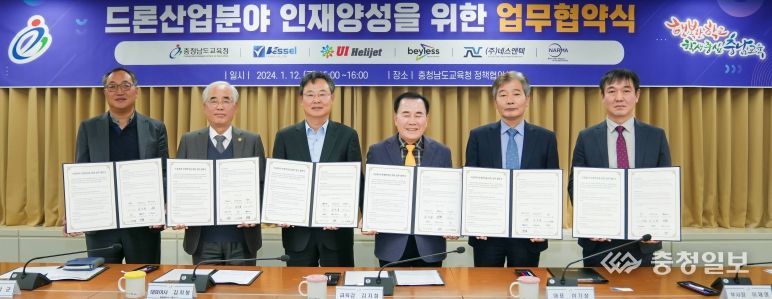 충청일보 박사현 기자 | 충남교육청이 12일 미래사회에 활약할 드론 분야 기술인재 양성을 위해 5개의 드론 산업체(△㈜베셀에어로스페이스, △㈜유아이헬리제트, △㈜베이리스, △㈜네스앤텍, △㈜나르마)와 업무협약을 체결했다고 밝혔다.