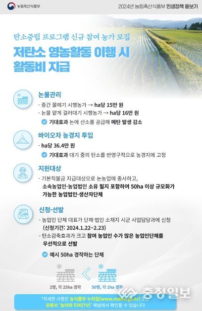 충청일보 김은경 기자 | 농림축산식품부는 탄소중립 프로그램 시범사업 참여 농업인 단체를 1월 22일부터 2월 23일까지 모집한다고 밝혔다.