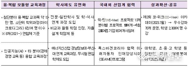 이번 행사에는 13개 연합체 소속 53개 대학의 교직원, 학생 등 400여 명이 참석하여 다양한 학문 간 융‧복합 모듈형 교육과정 운영, 유연한 학사제도 확산 등 2023년 사업성과와 이를 통한 대학 변화를 공유하고, 향후 사업 발전 방향을 모색한다.