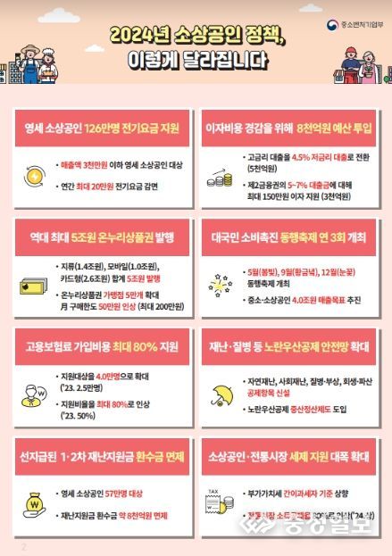 이후 고물가·고금리 등 어려운 경영여건 극복을 위해 영세 소상공인 대상 전기요금 지원 등 정부가 마련한 ‘2024년 달라진 소상공인 정책’ 8가지를 안내하고, 생업 현장에서 느끼는 소상공인의 어려움과 이를 해결하기 위한 정책방향에 대해 토론하는 시간을 가졌다.