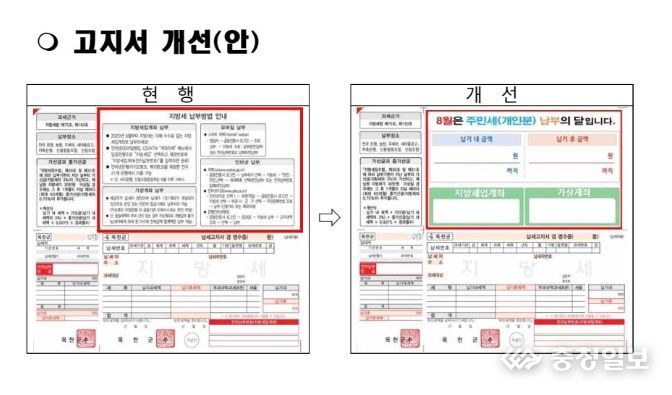 충청일보 김문호 기자 | 옥천군이 올해부터 어르신들을 위해 기존 고지서를 큰 글씨로 제작하여 지방세를 편리하게 납부할 수 있도록 개선한다.