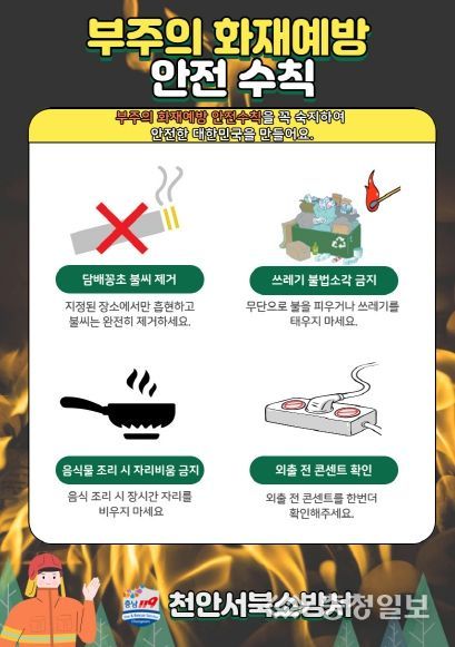 천안서북소방서는 부주의로 인한 화재를 예방하기 위해서 담배꽁초 불씨 제거 후 처리, 쓰레기 소각 및 논‧임야 태우기 금지, 음식물 조리 시 자리비움 금지, 화목보일러 사용 시 주변에 가연물 방치 금지 등이 있다고 강조했다.