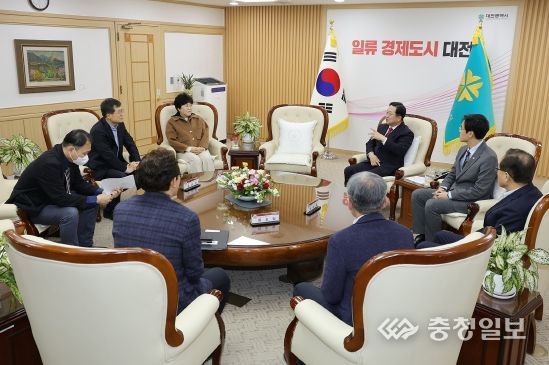 충청일보 곽채영 기자 | 이장우 대전시장은 18일 대전시청에서 후배 바이오기업의 성장을 위해 235억 규모의 투자조합을 결성(2023.4.)한 대전 소재 바이오텍 1세대 기업 ‘레고켐바이 오사이언스, 알테오젠, 수젠텍, 펩트론’ 대표를 만나 감사의 마음을 전했다.
