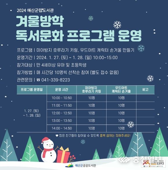 충청일보 박사현 기자 | 예산군립도서관은 겨울방학을 맞아 관내 유아와 초등학생을 대상으로 오는 1월 27일, 28일 이틀간 겨울방학 독서문화 프로그램을 운영한다.