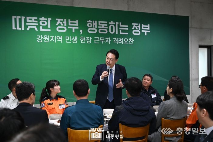 충청일보 김은경 기자 | 윤석열 대통령은 1월 19일 오후 강원특별자치도 강릉시를 찾아 경찰·소방·사회복지 공무원 및 환경관리원 등 현장 근무자 40여 명과 오찬을 함께했다.