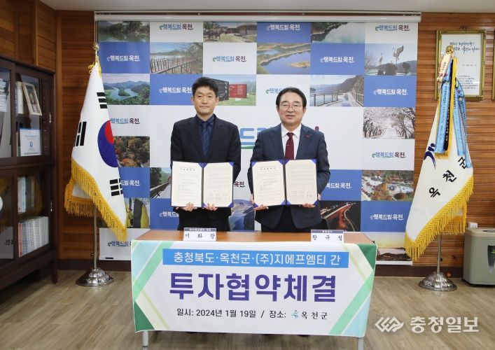 충청북도·옥천군·(주)지에프엠티는 지난 19일 옥천군청 군수실에서 황규철 옥천군수, ㈜지에프엠티 이화랑 대표 및 관계자들이 참석한 가운데 옥천테크노밸리 산업단지에 대한 투자협약을 체결했다.