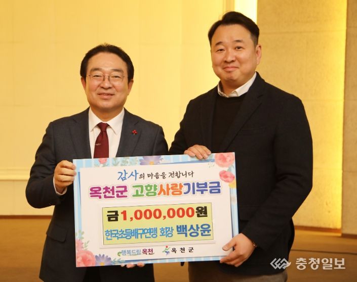 충청일보 김문호 기자 | 백상윤 한국초등배구연맹 회장이 충북 옥천군에 고향사랑기부금 100만 원을 기탁했다.