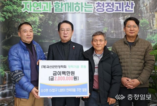 충청일보 김문호 기자 | 충북 괴산군은 소수면 수리2구 너분이 한옥마을 주민 일동이 괴산군민장학회에 장학금 200만 원을 기탁했다고 22일 밝혔다.