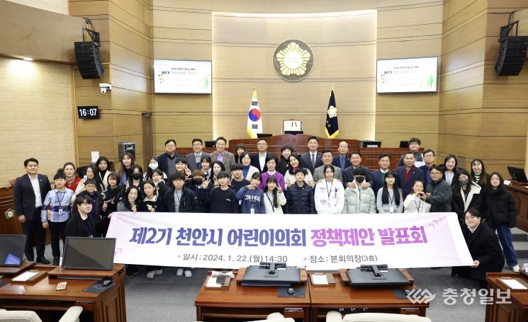 충청일보 박사현 기자 | 2024년 1월 22일 천안시의회 본회의장에서 천안시의회 정도희 의장을 비롯한 의원들과 26명의 제2기 어린이의회 의원들이 모여 천안시 발전을 위한 정책제안 발표회를 가졌다.