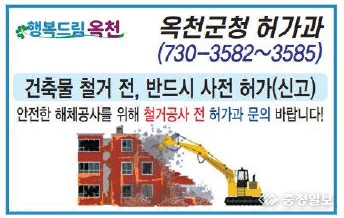 충청일보 김문호 기자 | 옥천군 허가과가 안전한 해체공사를 위해 위반 사항 예방 홍보와 함께 단속 강화에 나선다고 23일 밝혔다.