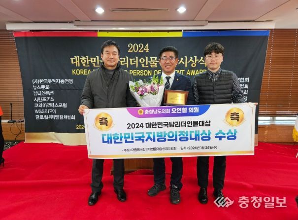 충남도의회 오인철 의원(천안7‧더불어민주)은 24일 한국프레스센터에서 열린 ‘2024 대한민국탑리더인물대상 시상식’에서 대한민국지방의정대상을 수상, 이 같은 수상 소감을 전했다.