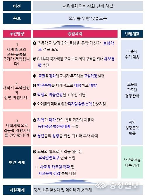 충청일보 김은경 기자 | 교육부는 1월 24일 2024년 주요정책 추진계획을 발표한다. ‘교육개혁으로 사회 난제 해결’이라는 비전 아래 교육개혁이 지역 곳곳에 성공적으로 뿌리내리는 한 해가 될 수 있도록 올해 중점적으로 추진할 10대 과제를 선정했다. 주요 내용은 다음과 같다.