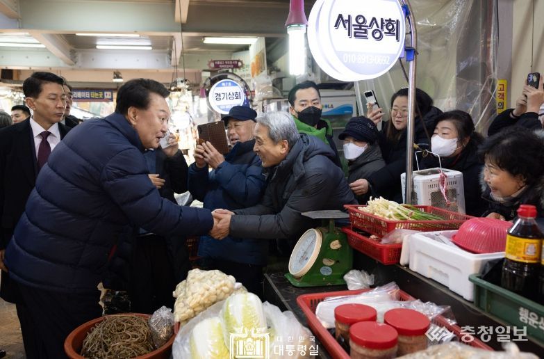 충청일보 김은경 기자 | 윤석열 대통령은 1월 25일 경기도의 대표 전통시장인 의정부제일시장을 찾아 최근 불경기에 동절기 한파까지 겹쳐 어려움을 겪고 있는 상인들을 격려하고 현장의 이야기를 경청했다.