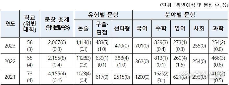 대학별고사 시행 대학의 전체 문항 중 0.3%가, 과목별로는 수학 0.4%, 영어 0.4%, 과학 0.8%가 '공교육정상화법'을 위반했으며, 국어‧사회 과목에서는 위반 문항이 없었다.