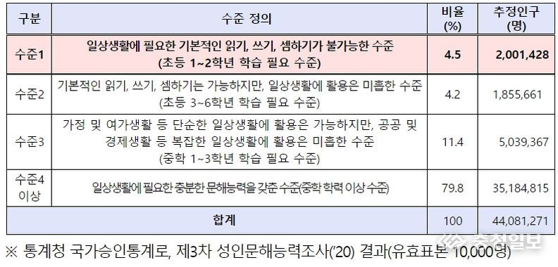 충청일보 김은경 기자 | 교육부는 교육기회를 놓친 비문해‧저학력 성인에게 문해교육의 기회를 확대하기 위한 '2024년 성인 문해교육 지원 사업 기본계획'을 발표한다.