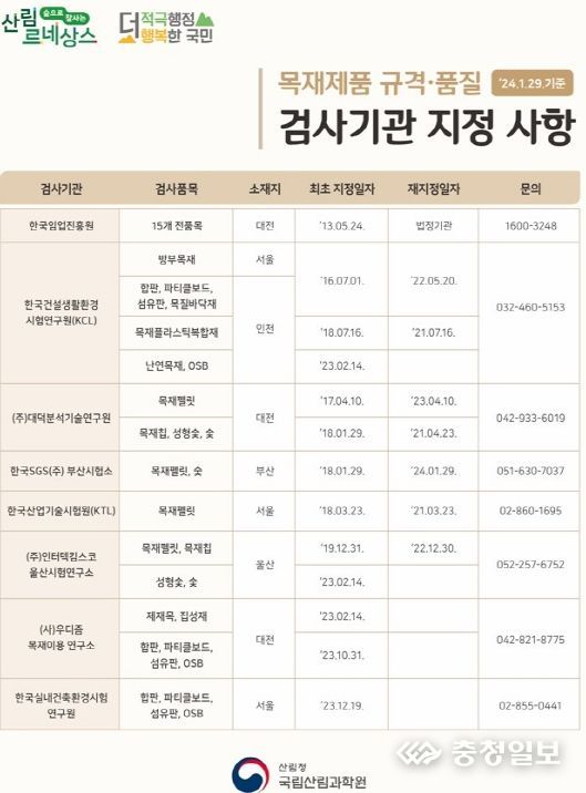 충청일보 김은경 기자 | 산림청 국립산림과학원(원장 배재수)은 1월 29일 ‘목재제품 규격‧품질 검사기관’으로 한국에스지에스(주) 부산지점을 재지정하면서 산림청 홈페이지에 검사기관 지정 사항을 공고했다고 밝혔다.