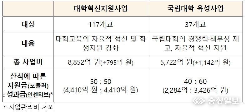 양 사업은, 대학의 자율 혁신을 통해 고등교육의 질을 제고하고 미래 인재를 양성하기 위한 포괄적 방식의 일반재정지원사업으로, 대학별 지원액은 재학생수, 교육여건지표 등 산식에 따라 배분되는 재정지원 사업비(포뮬러)와 대학혁신 성과평가 결과에 따라 배분되는 성과급(인센티브)로 구성되며, 대학혁신지원사업은 전년 대비 795억 원, 국립대학육성사업은 1,142억 원 확대됐다.