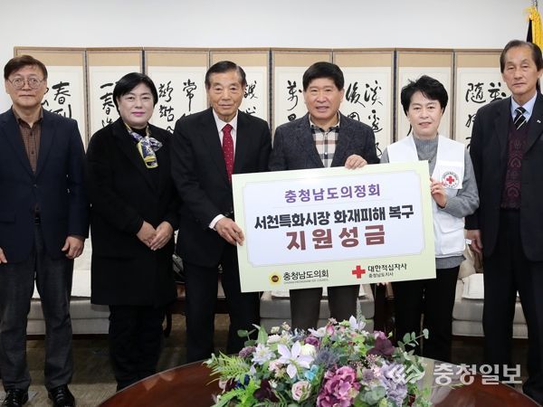 충청일보 박사현 기자 | 충청남도의정회는 최근 서천특화시장 화재 복구와 피해 상인들에게 위로의 마음을 전달하고자 성금을 대한적십자사 충남지사에 기탁했다.