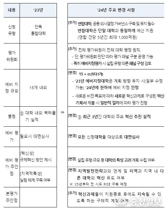 첫째, 작은 규모의 대학이 불리할 수 있고 대학 유형의 특수성을 반영해야 한다는 의견에 따라 올해부터는 2개 이상의 대학이 공동 의사결정기구를 구축하여 대학 간 연합 형태로 신청을 할 수 있도록 하고, 대학의 설립·규모 등 대학의 특성이 평가에 반영되도록 했다.