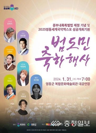 충청일보 김문호 기자 | 충청북도는 31일 영동군 복합문화예술회관 대공연장 중부내륙연계발전지역 지원에 관한 특별법(이하 중부내륙특별법) 제정 기념 및 2025영동세계국악엑스포 성공개최 기원 범도민 축하행사를 개최했다.