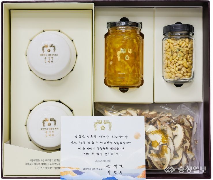 갑진년 설 선물은 전통주 산업을 활성화하고 지역 특산물의 소비를 촉진하기 위해서 차례용 백일주(공주), 유자청(고흥), 잣(가평), 소고기 육포(횡성) 등으로 구성됐다. 이번 선물은 포장 폐기물을 줄이기 위해 플라스틱을 최소화하고 재활용이 가능한 포장재와 보호재를 사용해 포장을 간소화했다.