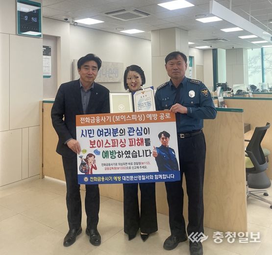 충청일보 곽채영 기자 | 대전둔산경찰서는 지난 30일 보이스피싱 범인 검거에 기여한 하나은행 A지점 직원 B씨에게 표창장을 수여했다.