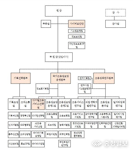 고용정보원은 정부 혁신 기조에 맞춰 대부서화를 통해 팀을 축소하되, 핵심 업무를 재배치하고 사이버 보안 및 디지털 전략기능을 강화하기 위한 취지로 기관 경영·정보화·연구 분야별 3본부 체계로 개편했다.