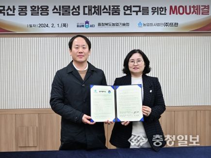 충청일보 김문호 기자 | 충북농업기술원은 1일 농업회사법인 (주)뜨란과 충북에서 생산한 콩을 활용한 대체단백식품 개발 등 상호협력을 강화하기 위하여 MOU를 체결했다.