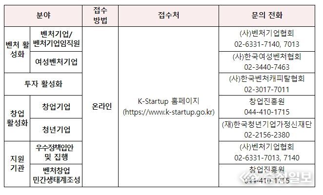 충청일보 김은경 기자 | 중소벤처기업부)는 대한민국 혁신성장의 주역인 벤처·창업기업을 대상으로 2월 2일부터 3월 8일까지 포상 대상기업을 발굴한다고 밝혔다.