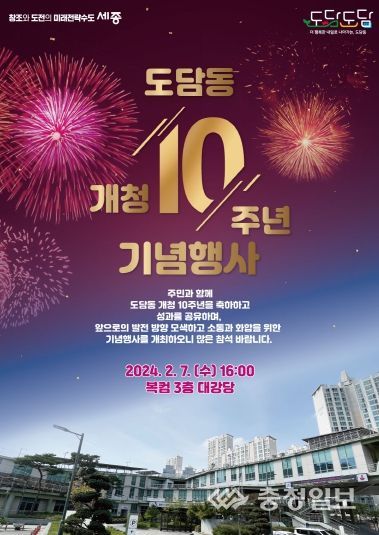 충청일보 김정운 기자 | 세종특별자치시 도담동이 오는 7일 도담동 개청 10주년을 맞아 도담동 복합커뮤니티센터 3층 대강당에서 기념행사를 개최한다.