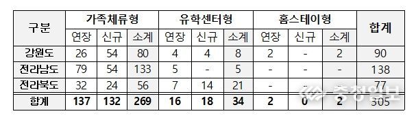 지역별로는 강원 (신규 58명, 연장 32명), 전남 (신규 54명, 연장 84명), 전북 (신규 38명, 연장 39명)으로, 신규 신청은 강원 지역이, 연장 신청은 전남지역이 가장 많다.