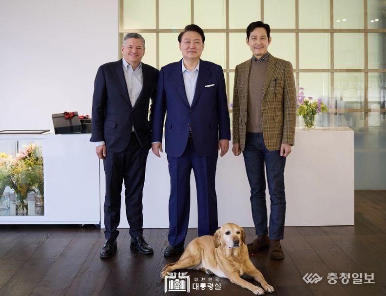 충청일보 김은경 기자 | 윤석열 대통령은 2월 17일 넷플릭스의 테드 서랜도스 공동대표와 넷플릭스 '오징어게임 2'에 출연하는 배우 이정재 씨를 대통령 관저로 초청해 오찬을 함께 했다.