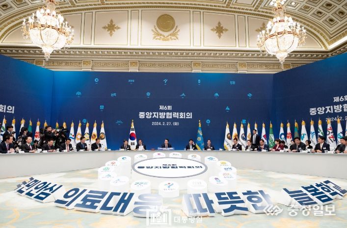 충청일보 김은경 기자 | 윤석열 대통령은 2월 27일 오후 영빈관에서 제6차 중앙지방협력회의를 주재했다. 오늘 회의는 중앙지방협력회의 개최 후 전국 17개 시도지사와 시·도 교육감이 한자리에 모인 첫 사례로, ‘의료 개혁’과 ‘2024년 늘봄학교 준비’ 2가지 안건을 논의했다.