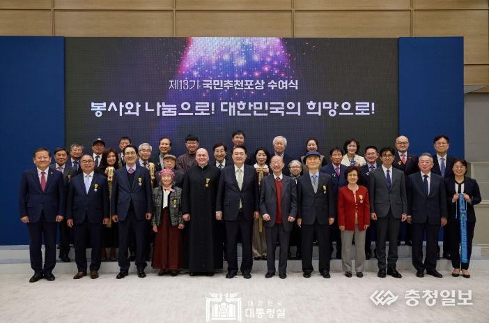 충청일보 김은경 기자 | 윤석열 대통령은 3월 15일 용산 대통령실에서 국민들이 추천해 공로자로 선정된 수상자들을 초청해 ‘제13기 국민추천포상 수여식’을 개최했다.