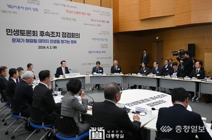 충청일보 김은경 기자 | 윤석열 대통령은 4월 2일 오후 정부세종청사에서 ‘문제가 해결될 때까지 민생을 챙기는 정부’를 주제로 「민생토론회 후속조치 점검회의(사회분야)」를 개최했다. 이날 회의는 민생토론회 실천 과제의 신속한 이행과 향후 계획을 점검하고, 개선된 정책을 국민에게 알기 쉽게 전달하기 위해 마련됐다.