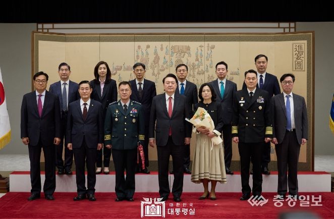 충청일보 김은경 기자 | 윤석열 대통령은 4월24일 오전 용산 대통령실에서 강호필 신임 합참차장으로부터 진급 및 보직 신고를 받고 삼정검 수치를 수여했다.