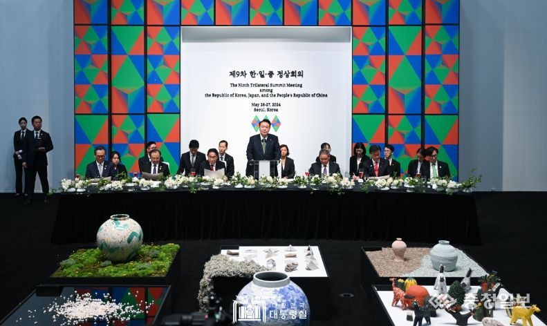 충청일보 김은경 기자 | 윤석열 대통령은 5월 26일 서울에서 제9차 한·일·중 정상회의에 참석한 기시다 일본 총리와 리창 중국 총리를 비롯한 3국 대표단을 환영하는 만찬을 함께했다.