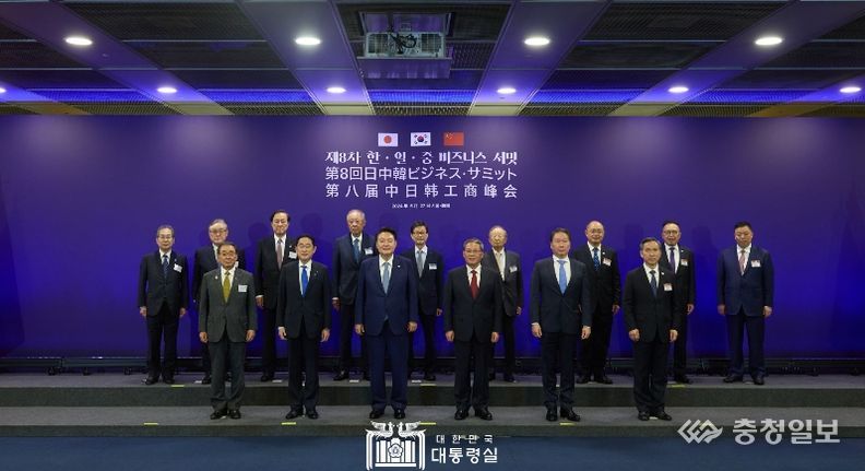 충청일보 김은경 기자 | 윤석열 대통령은 5월 27일 오후 대한상공회의소 국제회의장에서 열린 '제8차 한일중 비즈니스 서밋'에 기시다 후미오 일본 총리, 리창 중국 총리와 함께 참석했다. 한일중 정상회의를 계기로 열린 오늘 행사는 대한상공회의소, 일본 경제단체연합회, 중국 국제무역촉진위원회가 공동으로 주관했다.