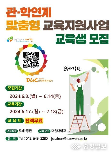 충청일보 김문호 기자 | 제천시와 대원대학교가 협력하여 지역주민의 전문 기술자격증 취득을 위한 맞춤형 직업교육인 ‘관학연계맞춤형 교육지원사업’ 교육생을 모집한다. 교육비는 전액 무료이며, 교육은 대원대학교에서 이루어질 예정이다.