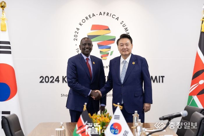 충청일보 김은경 기자 | 윤석열 대통령은 6월 4일 오후 한-아프리카 정상회의(6. 4~5)에 참석 중인 윌리엄 사모에이 루토(William Samoei Ruto) 케냐 대통령, 안드리 니리나 라주엘리나(Andry Nirina Rajoelina) 마다가스카르 대통령, 조셉 뉴마 보아카이(Joseph Nyumah Boakai) 라이베리아 대통령, 나나 아도 단콰 아쿠포아도(Nana Addo Dankwa Akufo-Addo) 가나 대통령과 각각 정상회담을 가졌다.