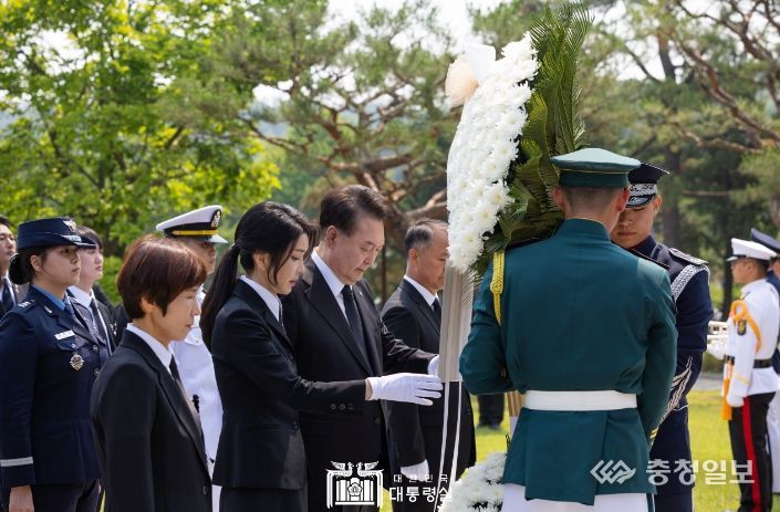 충청일보 김은경 기자 | 윤석열 대통령 부부는 6월 6일 오전 국립서울현충원에서 '대한민국을 지켜낸 당신의 희생을 기억합니다'를 주제로 열린 제69회 현충일 추념식에 참석했다. 올해 추념식은 국가유공자와 유족, 정부 주요 인사, 국회의원, 軍 주요 직위자, 중앙보훈단체장, 일반시민 등 5,000여 명이 참석해 순국선열과 호국영령의 명복을 빌고 위훈을 기렸다.