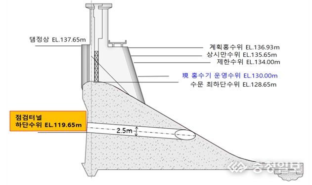 여기에 필요시 119.65m지점에 있는 점검터널을 개방할 경우 70㎥/s를 추가로 방류할 수 있어 홍수조절용량을 확보한다는 계획이다.