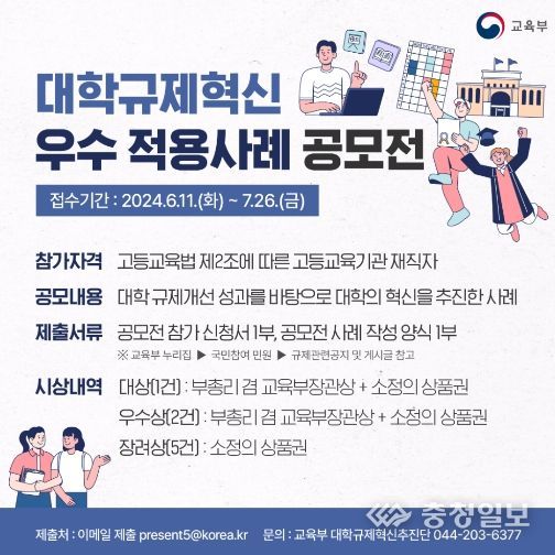 충청일보 김은경 기자 | 교육부는 6월 11일부터 규제개선을 토대로 대학 혁신을 이끈 사례를 공모하는 ‘대학규제혁신 우수 적용사례 공모전’을 개최한다.