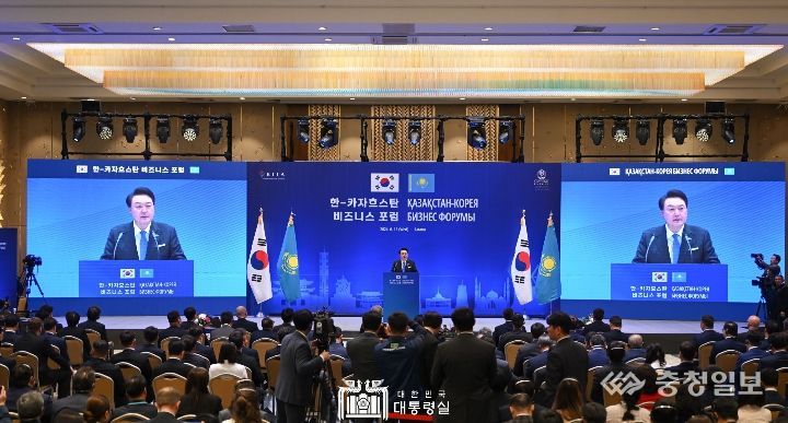 충청일보 김은경 기자 | 카자흐스탄을 국빈 방문 중인 윤석열 대통령은 6월 12일 오후 힐튼 아스타나 호텔에서 열린 「한-카자흐스탄 비즈니스 포럼」에 참석했다. “협력을 넘어 동반으로”라는 주제로 열린 오늘 포럼에는 카슴 조마르트 토카예프 카자흐스탄 대통령도 함께 참석했다.