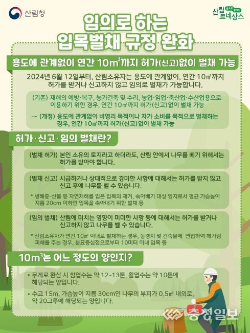 이에 따라 앞으로 산림소유자는 용도에 구애받지 않고, 연간 10㎥ 이내의 범위에서 별도의 허가나 신고 없이 벌채가 가능하다.