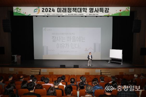 충청일보 박사현 기자 | 금산군은 지난 5일 금산다락원 생명의집 대공연장에서 강형기 충북대 교수를 초청해 ‘잘 사는 동네에는 이유가 있다’를 주제로 미래정책대학 명사초청특강을 개최했다.