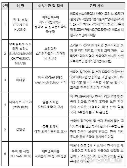 베트남 내 한국어 교육 책임자로서 초중등 교육과정에서의 한국어 제1·2외국어 채택 및 한국어 교원 양성 및 교재 개발 등에 기여한 ‘쩐 티 흐엉(Tran Thi Huong)’ 하노이국립대학교 교수와 스리랑카 내 한국어학과 운영 및 대입 시험에서의 한국어 과목 채택 등에 힘쓴 ‘수바싱하게 차투리카 닐라니(Subasinghage Chathurika Nilani)’ 스리랑카켈라니야대학교 조교수 등 총 6명이 2024년 한국어 보급 유공자로 선정됐다.