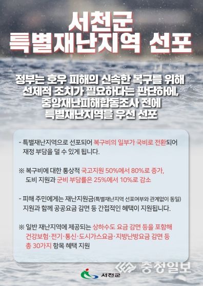 아울러 정부의 신속한 특별재난지역 선포로 복구비 일부가 국비로 전환되어 서천군의 재정 부담을 덜고, 피해 주민에게는 재난지원금 지원과 함께 공공요금 감면 등의 혜택이 추가로 지원될 수 있어 한시름 놓을 수 있게 됐다며 특별재난지역 선포의 의미를 설명했다.