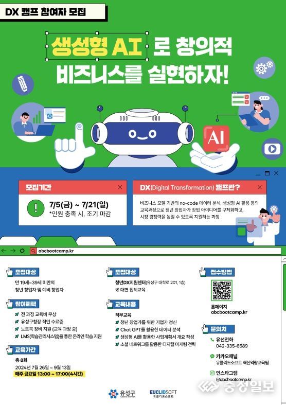 충청일보 곽채영 기자 | 대전 유성구는 오는 26일부터 8주간 청년(예비)창업자 맞춤형 디지털 역량강화 교육을 제공하는‘2024 창업청년 DX캠프’를 운영한다.