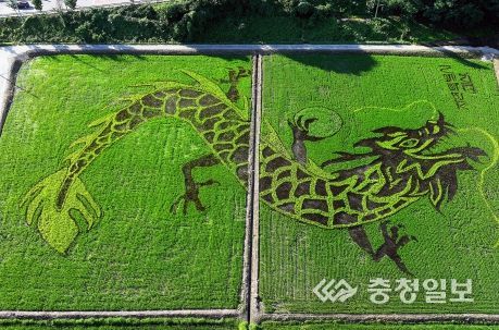 충청일보 김문호 기자 | 17일 충북 괴산군 문광저수지 인근 논에 유색벼로 그린 ‘용’이 바람에 살랑이며 살아 움직이는 듯한 장관을 펼쳐 눈길을 끈다.